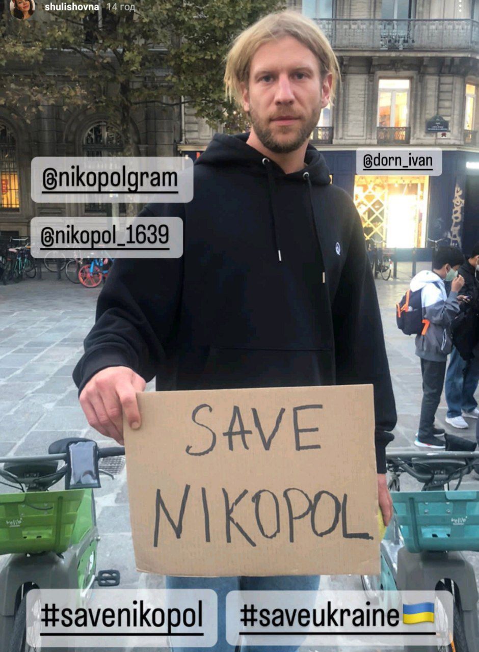 Сейчас по всему миру украинцы организовывают акции, чтобы привлечь внимание к Никополю и украинским городам, которые страдают от постояннымх обстрелов. 12 октября в Париже состоялся концерт ТНМК в поддержку Украины. В толпе заметили певца Ивана Дорна, присоединившегося к акции с табличкой с надписью "Save Nikopol".