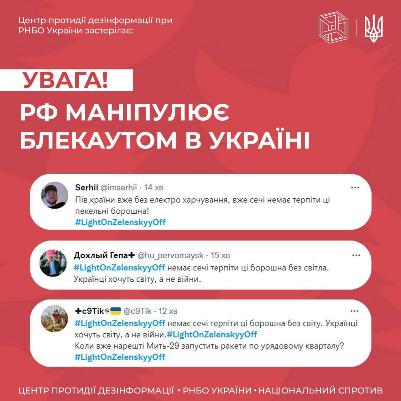 Об этом сообщили в Центре противодействия дезинформации при СНБО Украины. "В украинском сегменте соцсети Twitter и мессенджера Viber зафиксирован провокативный флешмоб #LightOnZelenskyyOff, который подхватили медиа РФ", – говорится в сообщении.