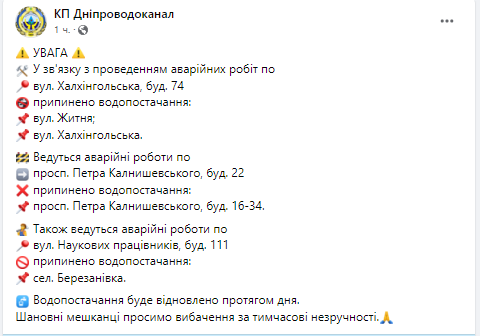 Кроме того, в связи с проведением аварийных работ по ул. Халхингольской, 74; просп. Петра Калнышевского, 22 и ул. Научных работников, 111 прекращено водоснабжение: