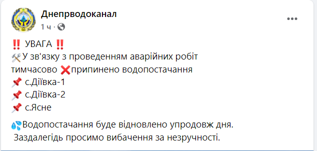 Кроме того, в связи с проведением аварийных работ временно приостановлено водоснабжение Диевки-1, Диевки-2, Ясного.