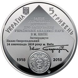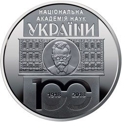 Вторая монета, посвященная НАН, из нейзильбера, имеет меньший номинал - 5 гривен, но гораздо больший тираж - 40 тысяч экземпляров.