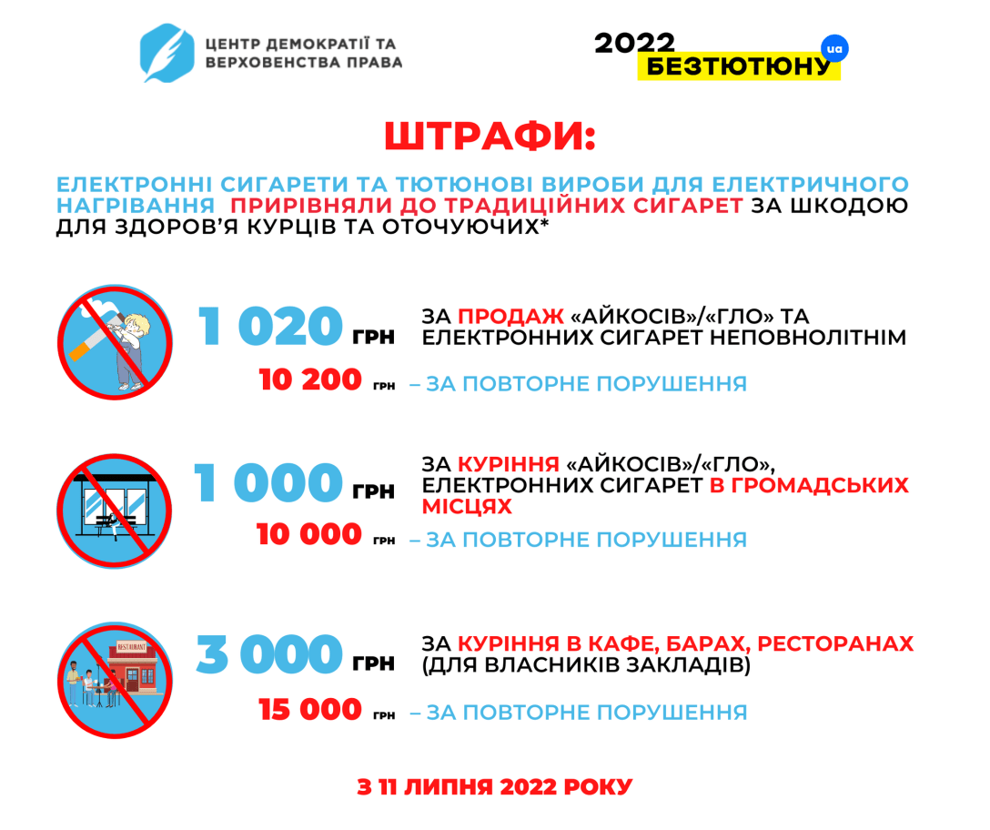 • за курение электронных сигарет в общественных местах — 1000 грн и 10 000 грн — за повторное нарушение;