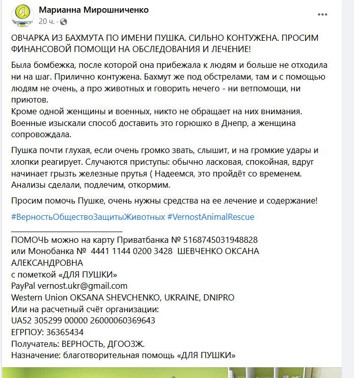 По ее словам, из Бахмута, который сейчас под сильными российскими обстрелами, эвакуировали овчарку. Спасением животного занялись военные и местная жительница. Собаку зовут Пушка, после очередной бомбежки она прибежала к людям, и после этого не отходила ни на шаг.