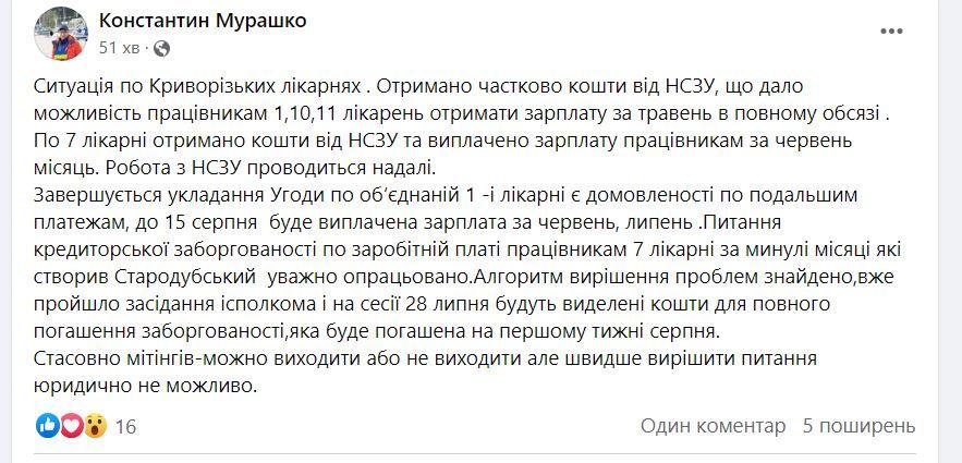 На эту ситуацию также отреагировал председатель Комитета по здоровью нации Михаил Радуцкий, который отметил, что будет следить за ситуацией. Чиновник отметил, что по данным НСЗУ, за предоставленные услуги, Криворожская городская больница №7 получила средства в полном объеме.