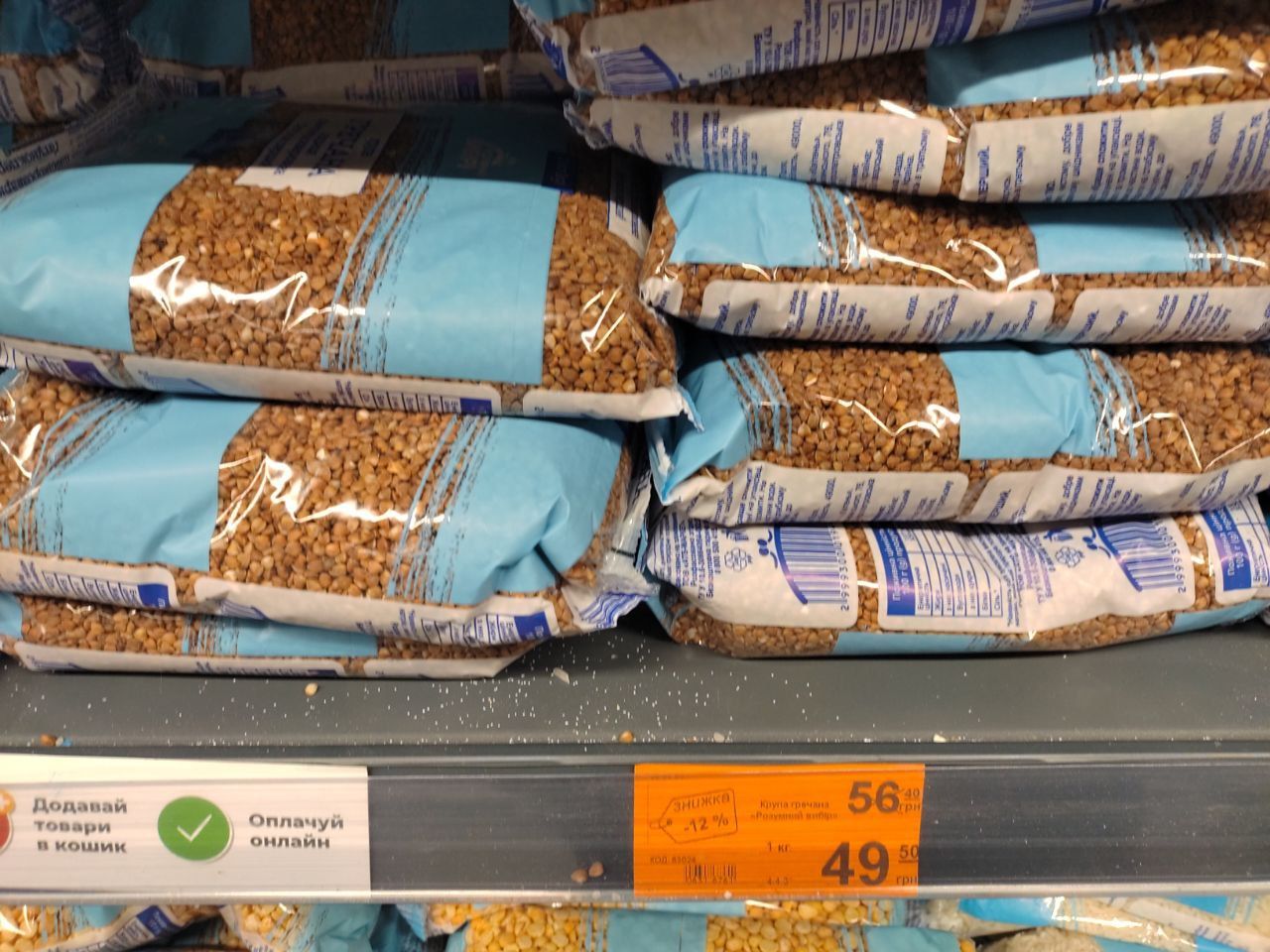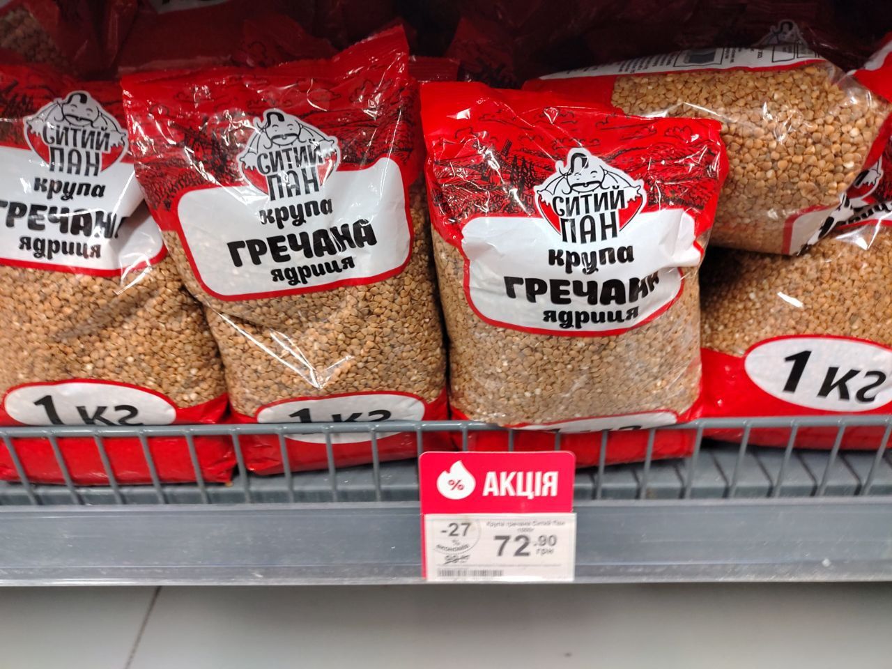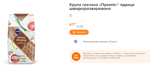 В магазине «Сильпо» продают гречневую крупу по цене 67,9 грн за кило. Без скидки ее цена на 79,9 грн.