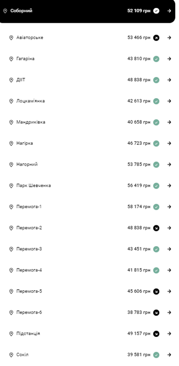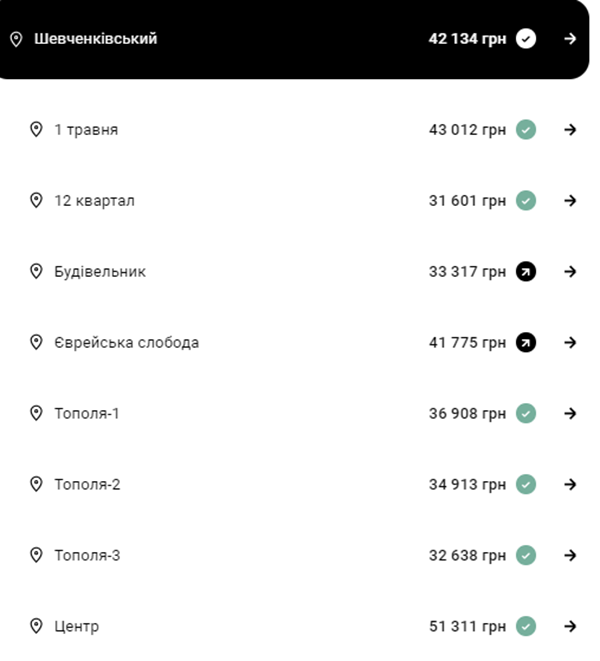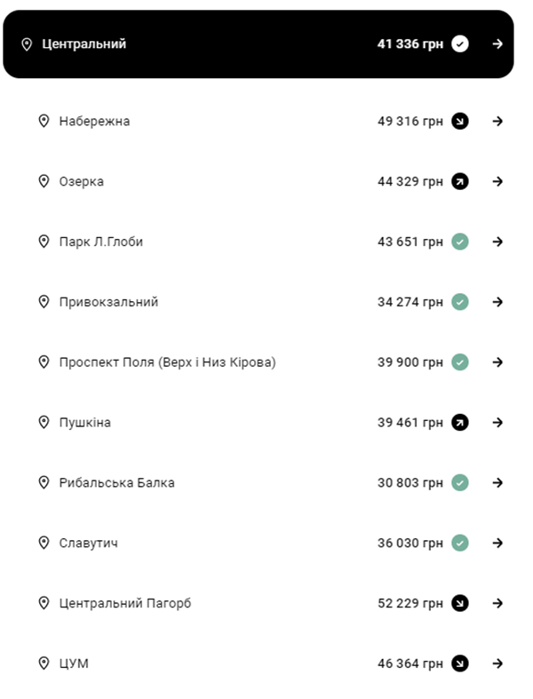 Средняя цена на квадратный метр в этом районе в среднем от 34,7 тыс грн. Дешевле всего продают недвижимость в районе Нового Клочко – 27,2 тыс грн. Дороже всего продают квадратные метры в районе Лесопарк – 57,1 тыс грн за кв м. Жилье на Левобережном обойдется в среднем 37 тыс грн за кв м.