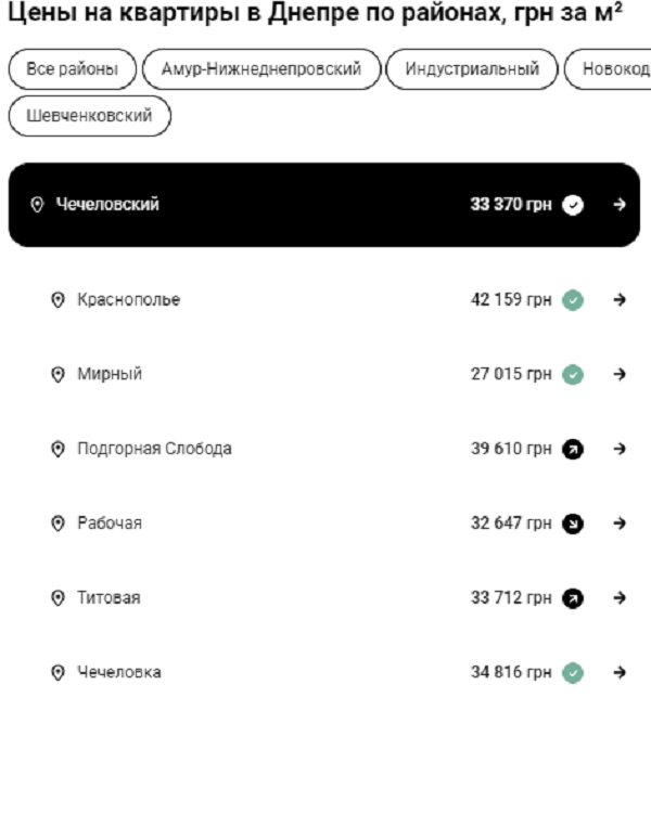 Средняя стоимость квадратного метра в Чечеловском районе Днепра – 33,3 тыс грн. Самые дешевые квадратные метры на поселке Мирный – за 1 хотят 27 тыс грн, самые дорогие – в Краснополье – тут за 1 кв м хотят 42 тыс грн. Средняя цена квадратного метра в 2-х комнатной квартире – 33-34 тыс грн.