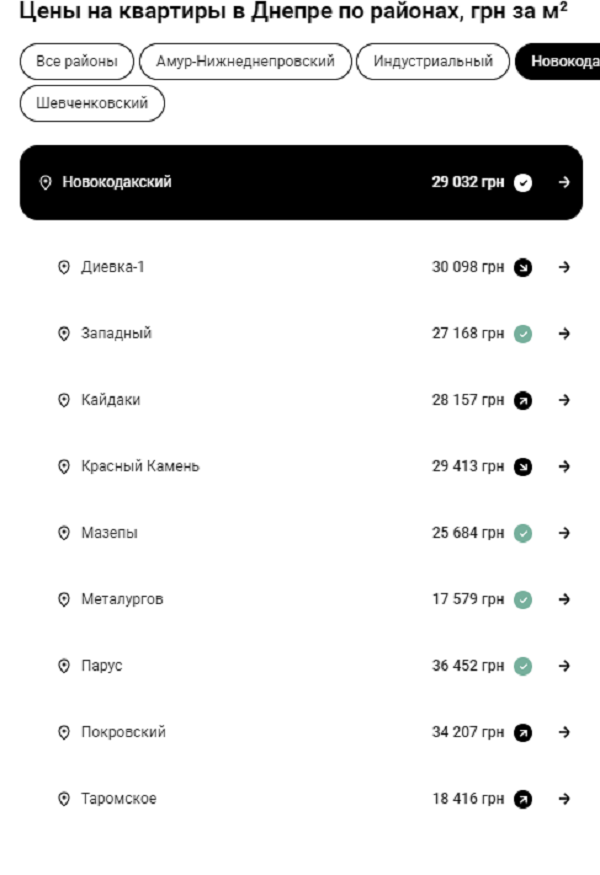 Средняя цена на 1 кв м в квартире в Новокодакском районе 29 тыс грн. Тут самое дешевое жилье в Таромском – за 1 кв м просят 18 тыс грн, а самое дорогое – в Диевке-1. Стоимость 1 кв м жилья тут оценивается в 30 тыс грн. Средняя цена за 1 кв м в двухкомнатной квартире в этом районе – порядке 24 тыс грн.