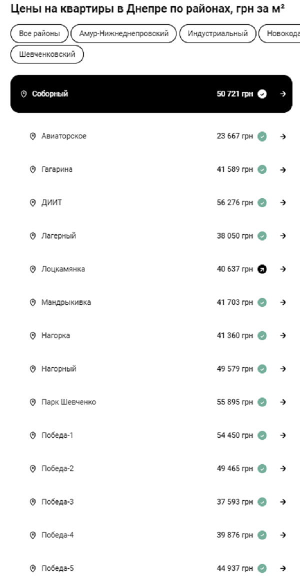 В Соборном районе Днепра стоимость 1 кв м квартиры в многоэтажном доме в среднем составляет 50,7 тыс грн. Самые дешевые квадратные метры – в Авиаторском. Тут за 1 кв м хотят в среднем 23,6 тыс грн. Самое дорогое – в районе ДИИТа – 56 тыс грн за 1 кв м. Средняя цена квадратного метра жилья в двухкомнатной квартире в этом районе составляет 45 тыс грн.