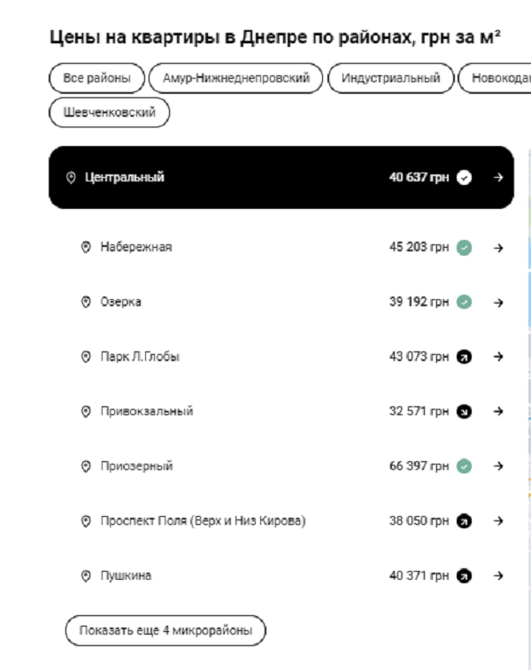 Средняя стоимость квадратного метра в Центральном районе Днепра – 40,6 тыс грн. Самое дешевое жилье тут продается в районе Привокзальной – от 32,5 тыс грн в среднем за 1 кв м. Самое дорогое – в районе Приозерного – 66,4 тыс грн за кв м. Средняя ценовая категория квадратного метра жилья в двухкомнатной квартире в этом районе – 44 тыс грн.