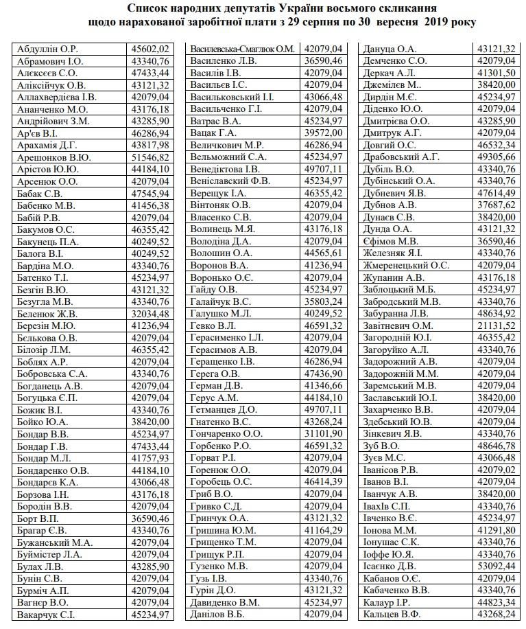 Председатель Рады Дмитрий Разумков получил за период с 29 августа по 30 сентября 50 500 гривен. Вице-спикер Рады Елена Кондратюк получила 49 800 гривен.