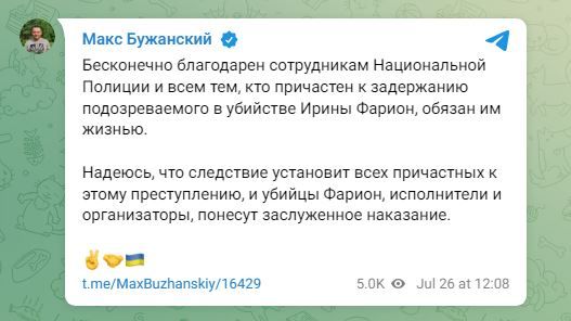 Нардеп из Днепра Бужанский отреагировал на эту информацию и поблагодарил полицию за задержание причастных к убийству Фарион.