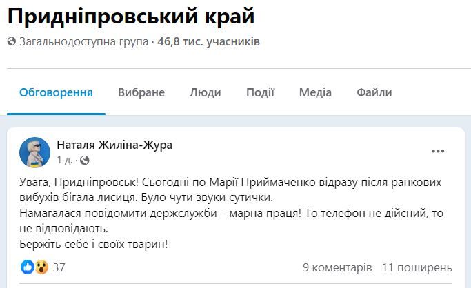 Это произошло незадолго после утренних взрывов. Женщина пыталась сообщить об этом случае госслужбы, но в тот день дозвониться не удалось. Днепрянка предупреждает соседей о появлении лисы, так как она может напасть на домашних животных.
