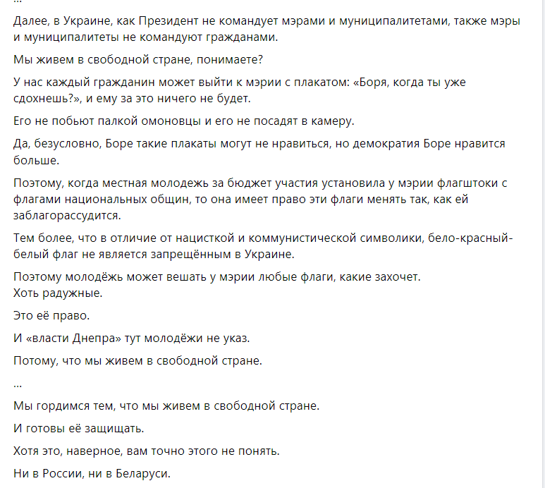 Мэр Днепра еще раз отметил, что это была инициатива местной молодежи, которая и установила перед зданием горсовета аллею с флагами. А так как бело-красно-белый флаг не является запрещенным в Украине, то может законно висеть где угодно.