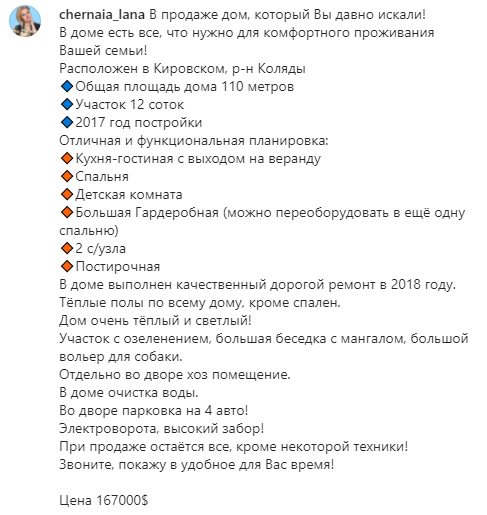За дом в Кировском девушка хочет выручить 167 тысяч долларов (4,5 миллиона гривен). Общая площадь 110 кв.м. Есть участок земли на 12 соток. Есть кухня-гостиная с видом на веранду, спальня, детская комната, большая гардеробная, санузлы. Построен в 2017 году, а в 2018 сделали хороший ремонт.