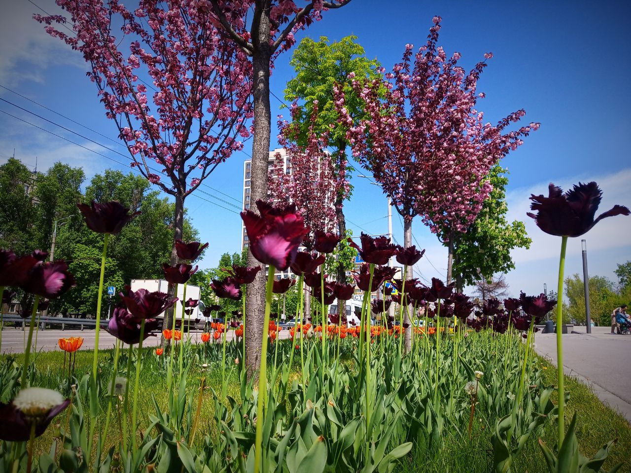 В этом году Днепр заполонили тюльпаны самых разных цветов: оранжевые и белые, красные и фиолетовые, желтые и розовые.