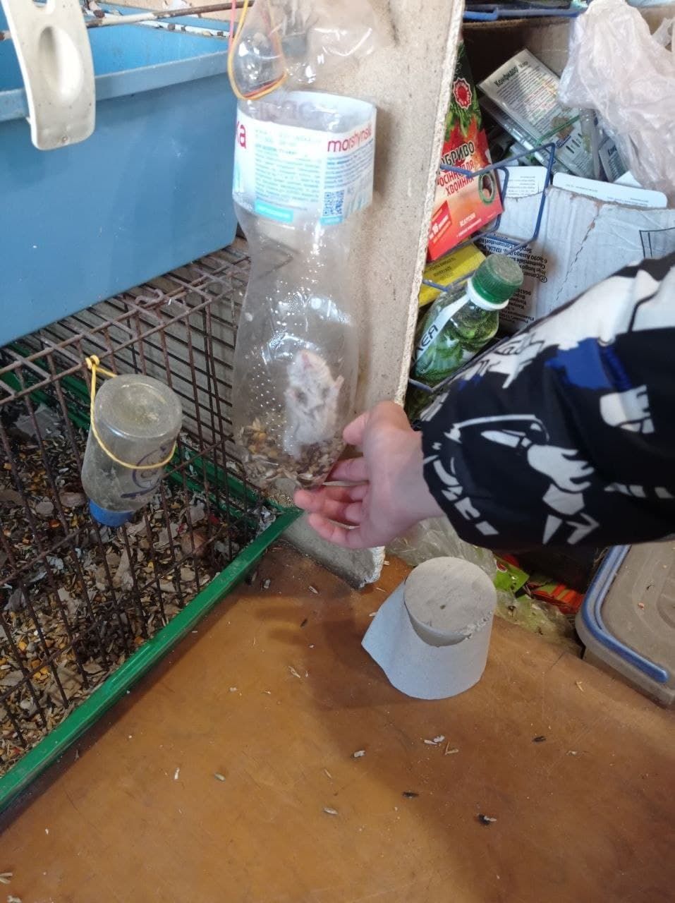 В Днепре в зоомагазине на Березинской, 23а хомяк живет в ужасных условиях. Бедного грызуна посадили в пластиковую бутылку из-под воды, у которой срезали верхушку. Рядом стоит грязная клетка, но в ней нет животных. Не понятно, находится ли там хомяк постоянно или пересилили его туда на время.