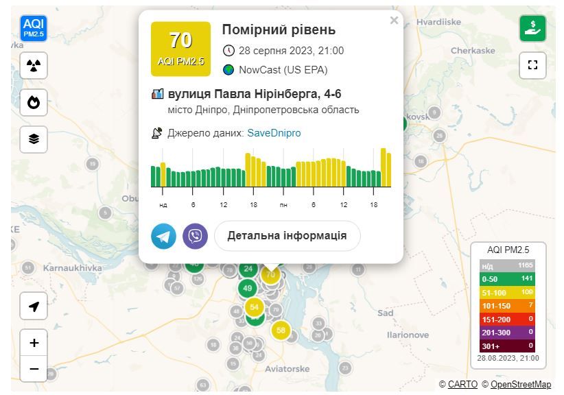 По данным независимого сайта, отслеживающего качество воздуха в Днепре, показатели уровня загрязнения находятся в пределах нормы, но в некоторых районах есть превышение допустимых значений.