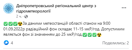 Так, по сообщению Днепропетровского регионального центра по гидрометеорологии, радиационный фон на Днепропетровщине находится в норме и составляет 11-15 мкР/час.
