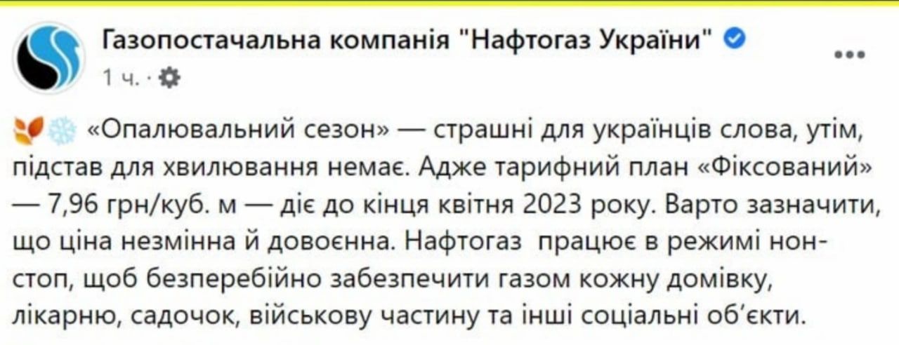 Тарифный план "Фиксированный" – 7,96 грн/куб. м – действует до конца апреля 2023 года. Цена неизменная и довоенная, – отметили в "Нафтогазе".