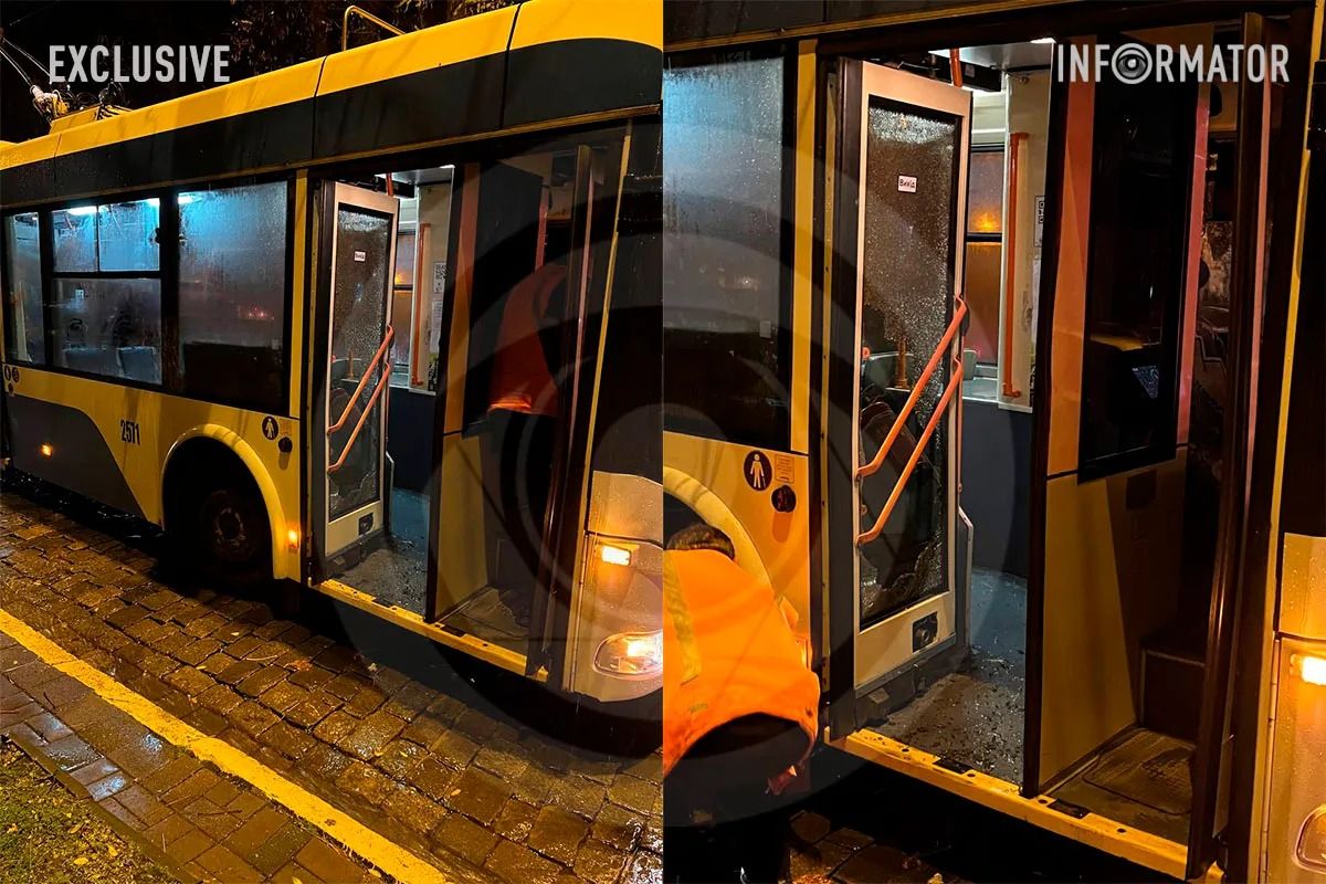 Стекло летело в разные стороны: в Днепре разбили дверь троллейбуса №1