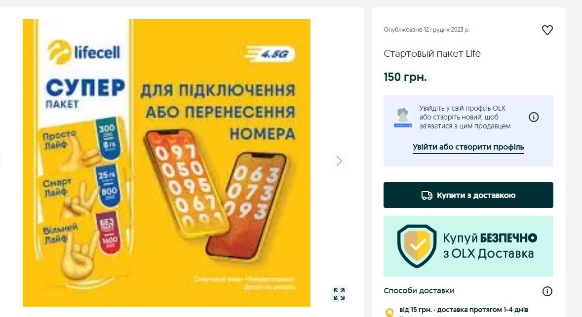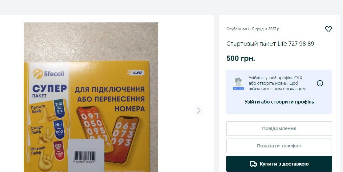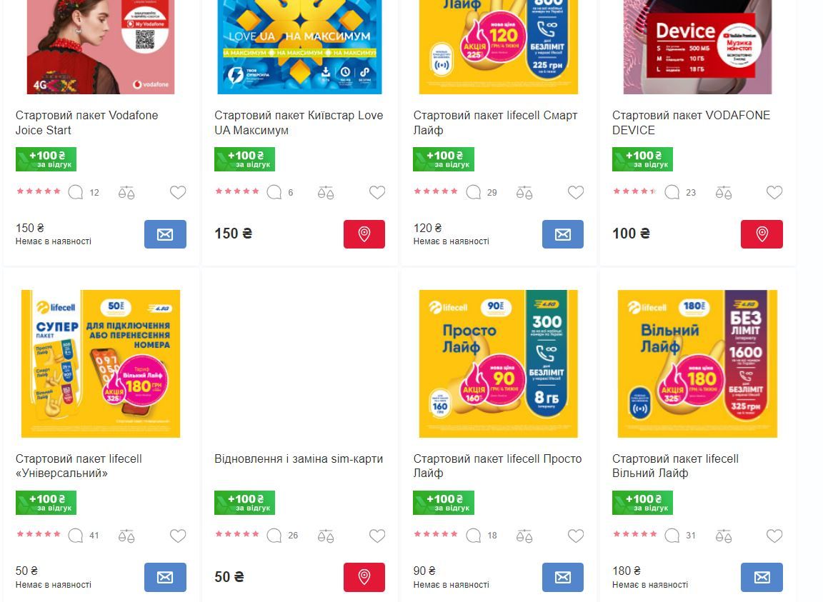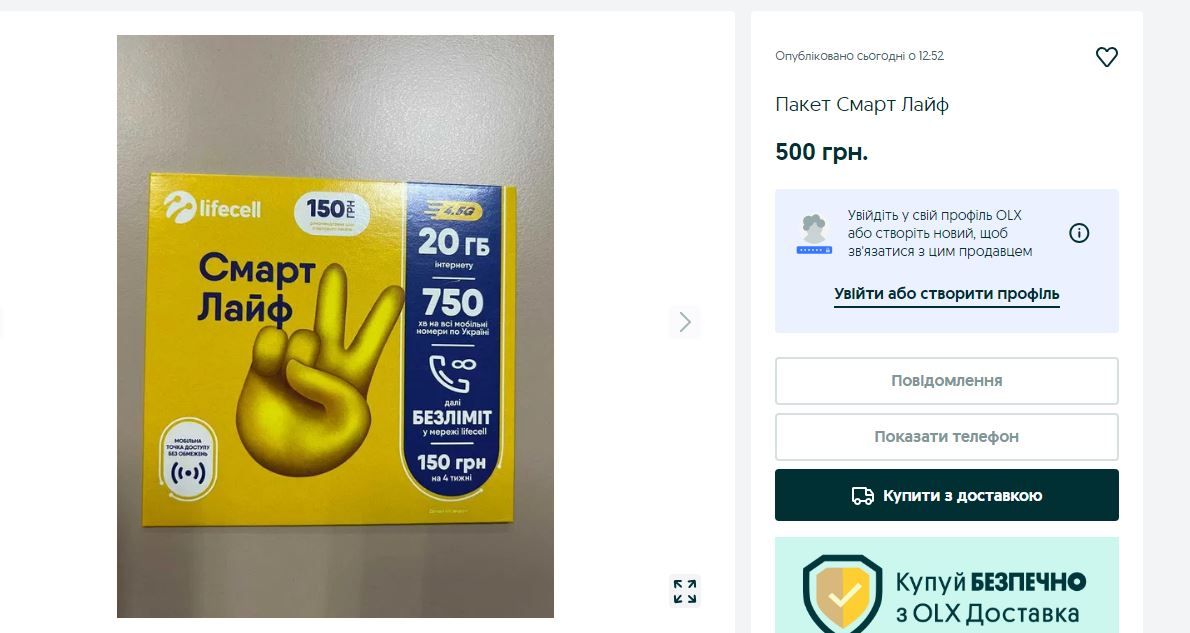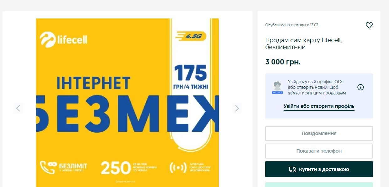 Самый дорогой лот удалось найти в Кривом Роге. За 3 тысячи гривен пытаются продать стартовый пакет lifecell. Автор объявления говорит, что пакет безлимитный и его не нужно пополнять до конца военного положения, поскольку активировали его как для военного.