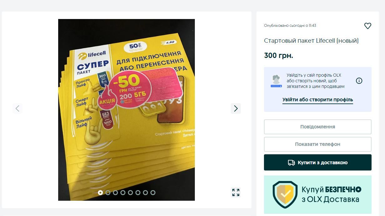 Этот же стартовый пакет готовы продать за 300 гривен. Тоже в Днепре, но готовы отправить по почте. Автор объявления говорит, что в наличии 7 свободных сим-карт.