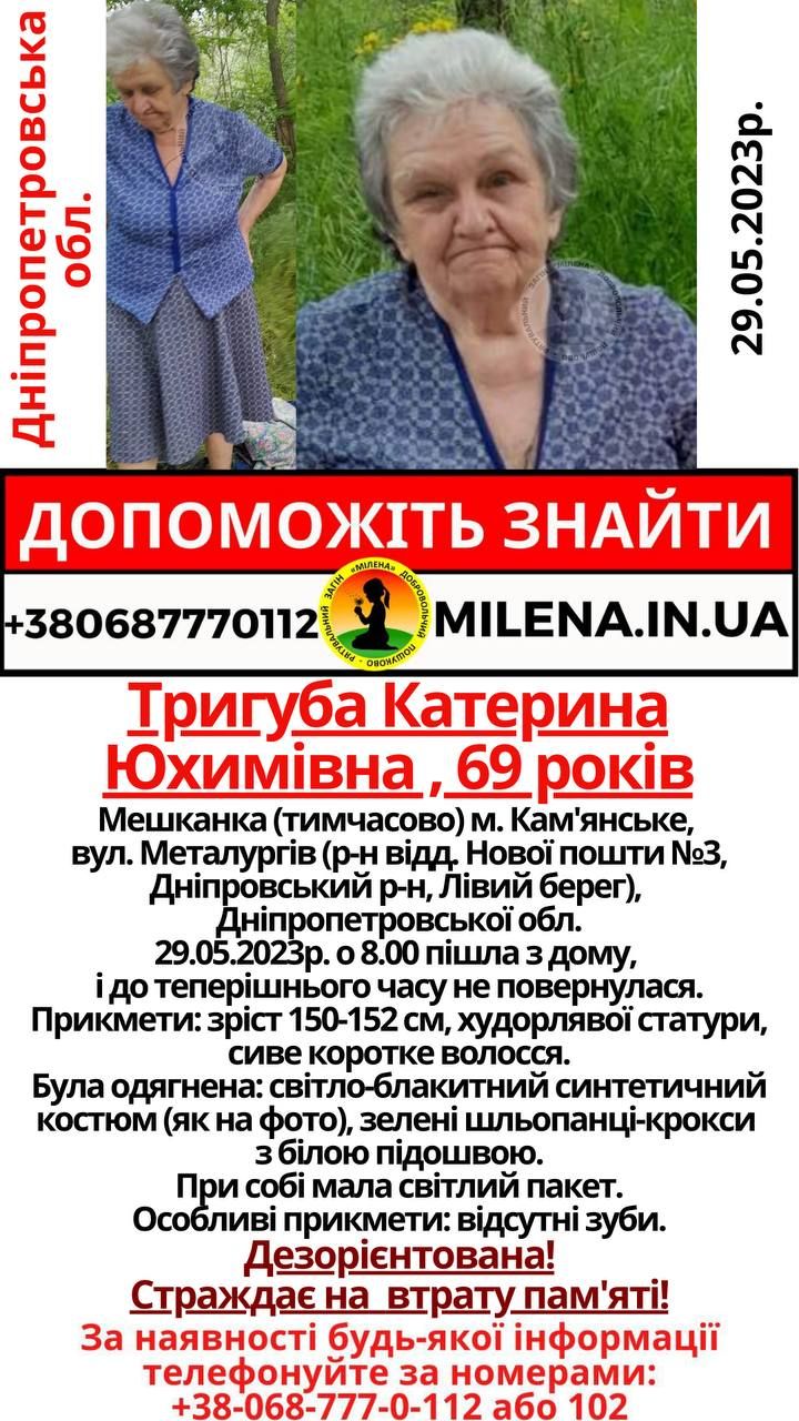 В Каменском ищут 69-летнюю Екатерину Ефимовну Тригубу. Последний раз женщину видели в 8 утра 29 мая. По словам родных, она ушла из дома, который на улице Металлургов, и до сих пор не вернулась домой.
