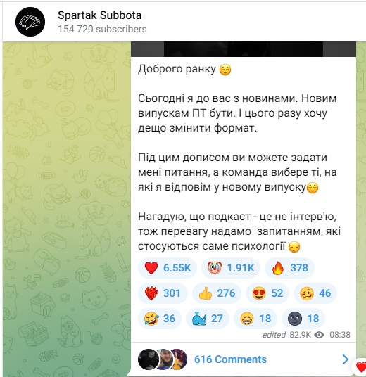 Новым выпускам ПТ быть. И в этот раз хочу несколько изменить формат. Под этим сообщением вы можете задать мне вопросы, а команда выберет те, на которые я отвечу в новом выпуске. Напоминаю, что подкаст – это не интервью, поэтому предпочтение отдадим вопросам, касающимся именно психологии, – написал Суббота в своем Telegram-канале.