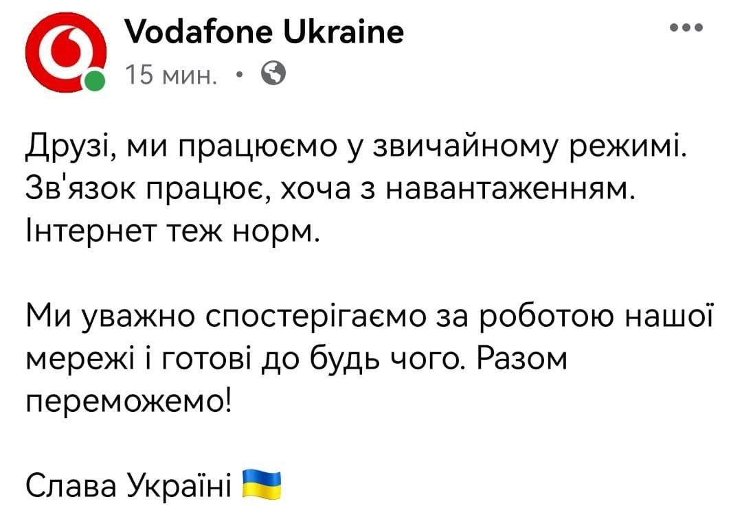 В компании Vodafone Ukraine заявили, что на данный момент они работают в обычном режиме: