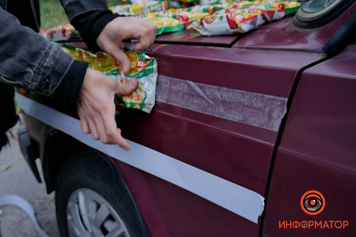 Упаковки лапши на кузов автомобиля закрепили двусторонним скотчем. Таким необычным способом Давид решил устроить «праздник для студентов».
