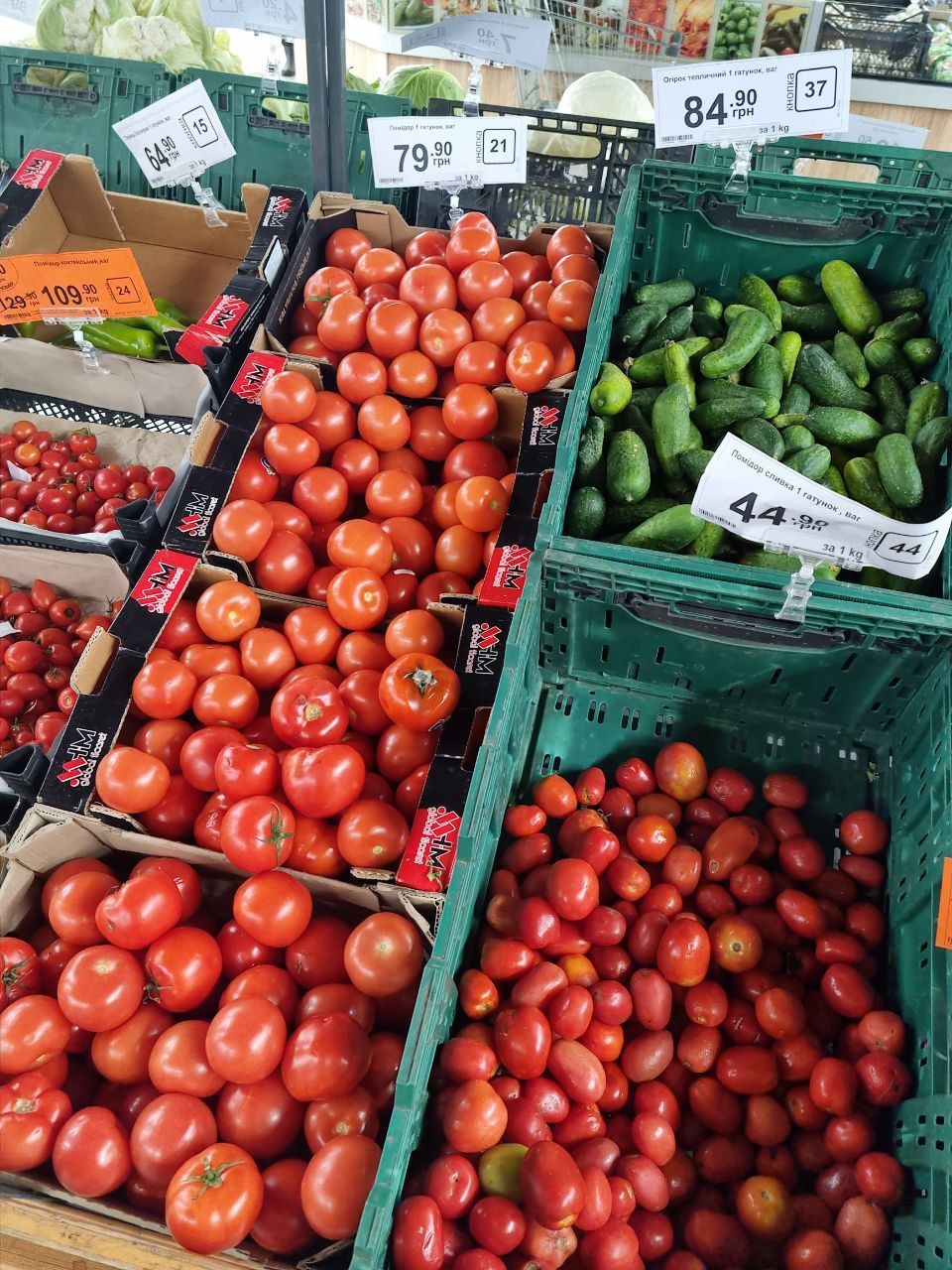 Самая маленькая цена на огурцы – 70 гривен. За помидоры минимально просят 44 гривен, но это второсортные "избитые жизнью" томаты. В среднем, стоимость огурцов составляет 80 гривен. Помидоров так же – 80-85 гривен.