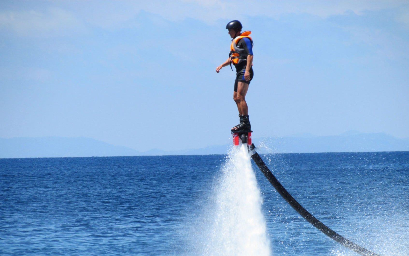 Флайбординг – это полет на специальной доске, которая за счет мощного потока воды позволяет подняться на несколько метров в воздух, а также поворачиваться вокруг своей оси и зависать на месте. Подняться можно на высоту до 5 метров. 10 минут полета над водой обойдутся в 1500 грн. К аттракциону допускаются только люди умеющие плавать.