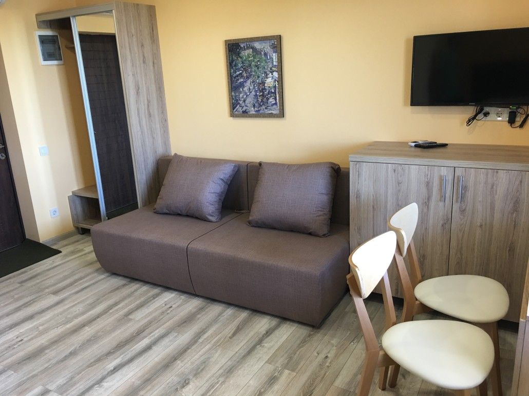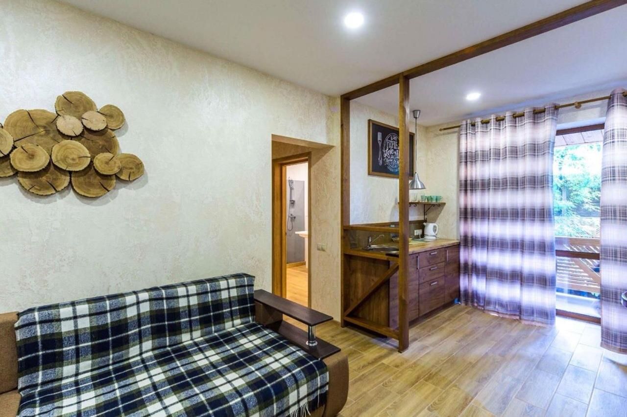 В номере есть отдельна комната и кухонная зона, оборудованная микроволновкой, холодильником. В самом номере есть двуспальная кровать, он рассчитан на двух человек. Проживание в коттедже для 4-х человек обойдется в 1,8 тыс грн в сутки.