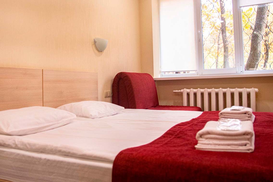 Самый дешевый номер тут называется «Стандарт+» в нем есть душевая, туалет, телевизор, большая двуспальная кровать и окна с видом на лес. Сутки проживания в таком номере для двух человек обойдутся в 2,5 тыс грн. В стоимость включен завтрак и посещение бассейна.