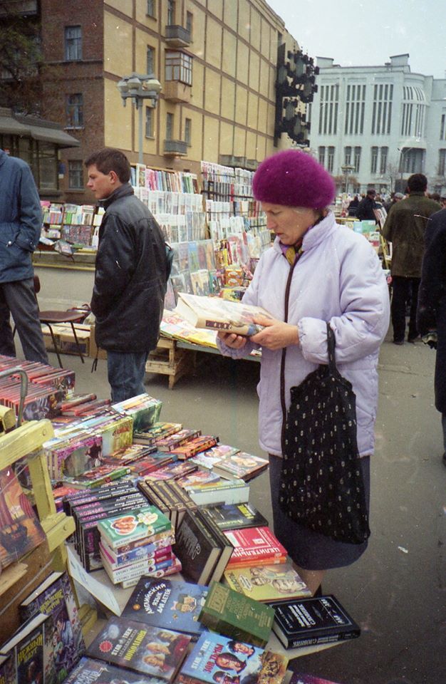 На Книжном рынке товар продавался на импровизированных прилавках, а иногда продавцы просто раскладывали книги на лавочке.