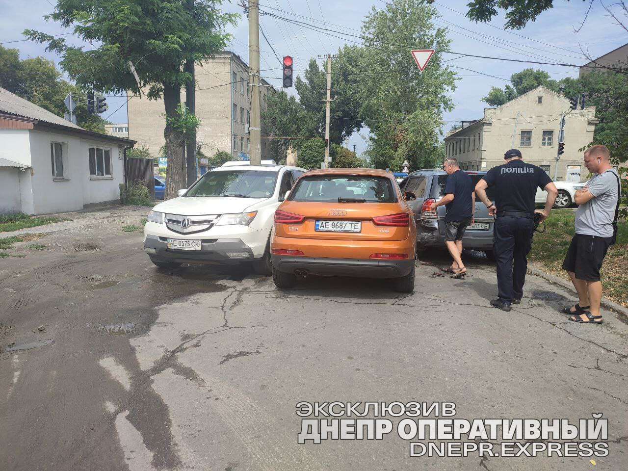 ДТП на перекрестке улиц Канатная и Владимира Антоновича в Днепре произошло сегодня, 16 августа, в районе обеда. По словам одного из участников аварии водитель на Audi, чтобы, по всей видимости, проскочить на «красный», решила объехать стоящий на перекрестке в ожидании разрешающего движение сигнала светофора автомобиль Opel. В это же время с улицы Владимира Антоновича на Канатную выворачивал автомобиль Acura. В результате, Audi протаранил оба автомобилей.
