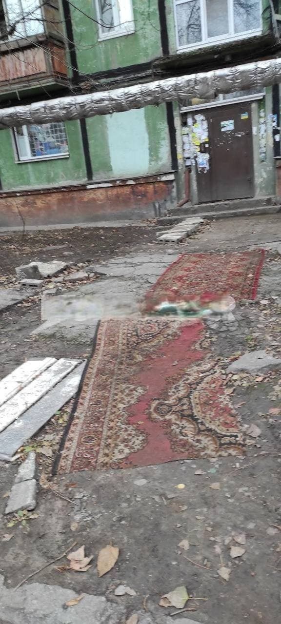 В Днепре жители продолжают избавляться от старых ковров оригинальными методами. Теперь ненужные ковровые дорожки положили у входа в подъезд.