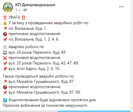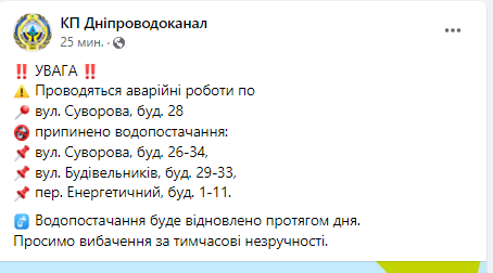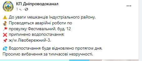 Об этом сообщает КП "Днепрводоканал".