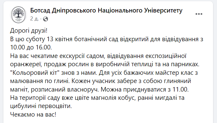 В эту субботу, 13 апреля, ботанический сад Днепровского национального университета будет открыт для посещения с 10:00 до 16:00.