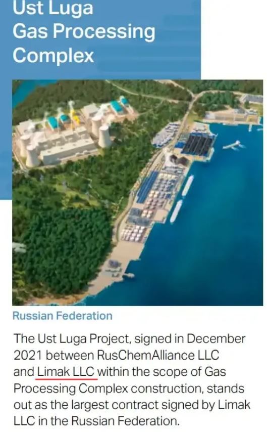 Строительство комплекса по переработке газа в Усть-Луге можно назвать одним из самых масштабных проектов "Лимака" в России. В его рамках турецкая компания строит дома управления, энергоцентра, складские здания, объекты водоснабжения, лабораторий, а также трубопроводный мост протяженностью 4,5 км, линии высокого напряжения, трансформаторные будки. На строительстве объекта на общей площади 50 га будут работать около 2500 человек. Завершить проект планируется в 2025 году.