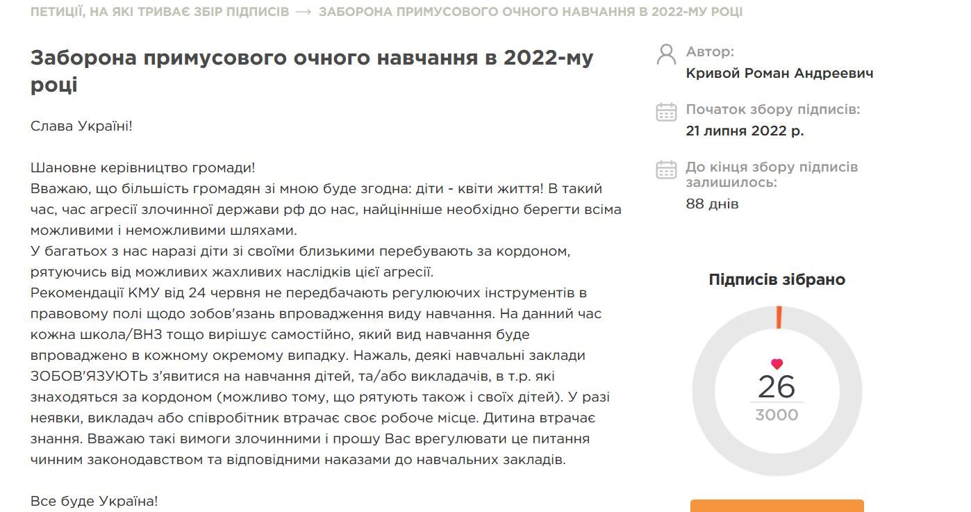 На сайті єдиних електронних петицій створили голосування, у якому пропонують заборонити примусове очне навчання. Автор петиції Роман Кривой, створили її 21 липня і вже є 26 підписів.