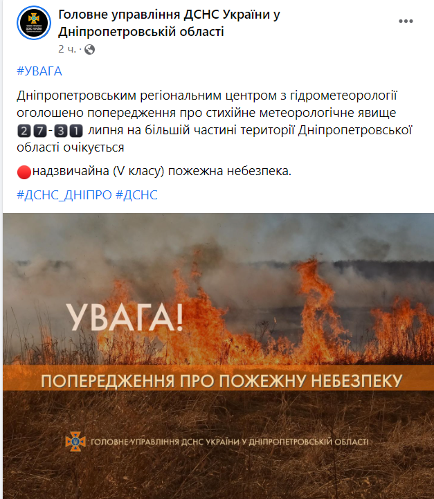 Так, із 27 до 31 липня на більшій частині території Дніпропетровської області очікується надзвичайна (V класу) пожежна небезпека.