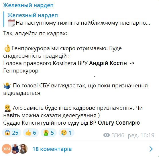 Нардеп Ярослав Железняк розповів, що нового генерального прокурора назначать наближчим часом. Ним стане голова правового комітету ВРУ Андрій Костін. А от щодо голови СБУ все поки не так однозначно. Кандидатура ще не обрана і призначення відкладається.