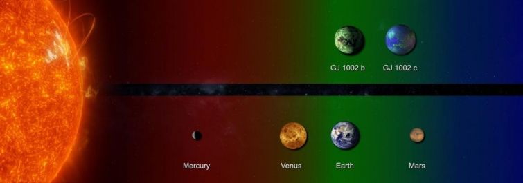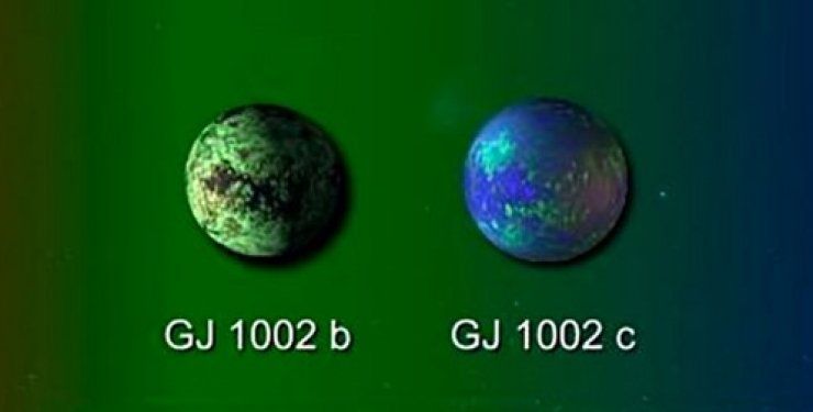 Две планеты GJ 1002b и GJ 1002c расположены вне Солнечной системы на расстоянии около 16 световых лет от нас. Они вращаются вокруг красного карлика и имеют массу, подобную массе Земли.