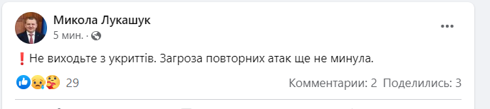 Не выходите из укрытий. Угроза повторных атак еще не миновала, – написал он.