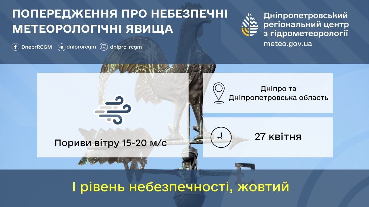 В понедельник, 27 апреля, в Днепре и области прогнозируется ухудшение погодных условий. Как предупреждает Днепропетровский гидрометцентр, ночью и утром ожидаются заморозки 0-5°. Также прогнозируются порывы ветра 15-20 м/с. Объявлен желтый уровень опасности.