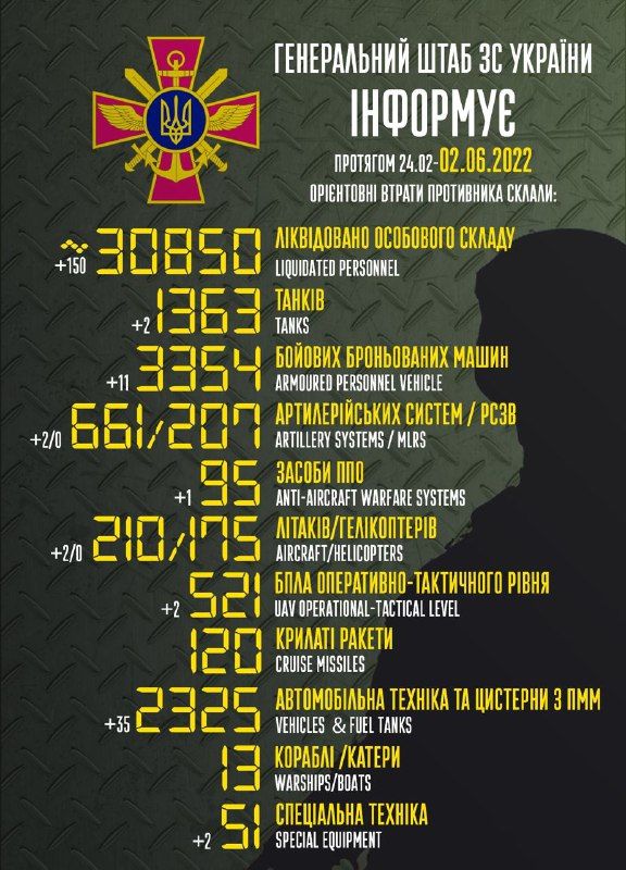 Общие боевые потери противника с 24.02 по 02.06 ориентировочно составили: