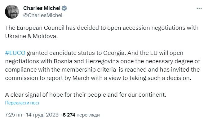 Лидеры ЕС решили начать переговоры о вступлении Украины в Европейский союз, сообщил президент Европейского совета Шарль Мишель.