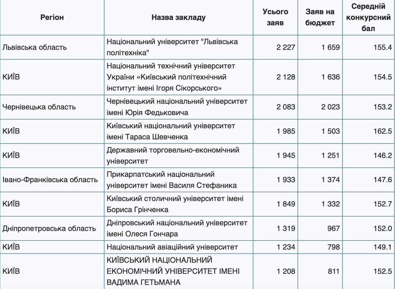 - 1 место – Национальный университет "Львовская политехника" – 2227 заявлений, из них – 1659 на бюджет.